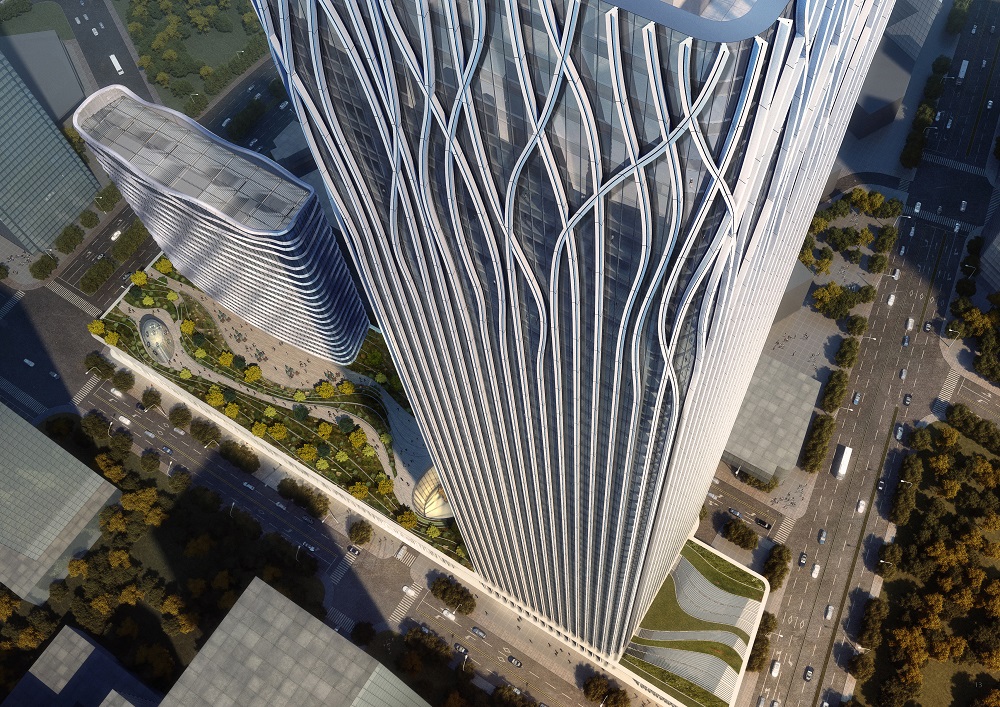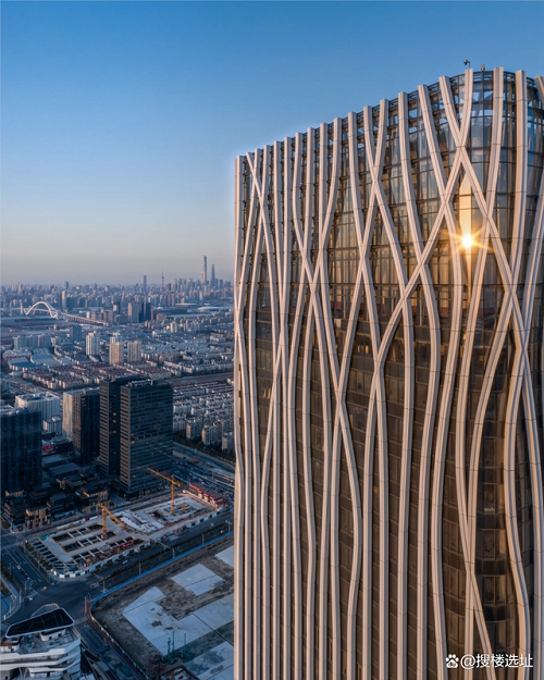設(shè)計(jì)大師“樹”的設(shè)計(jì)理念突出體現(xiàn)在外立面幕墻。鋁幕線條從6層開始齊頭并進(jìn)直至215米處,之后線條開始不規(guī)則地“開枝散葉”,使得前灘中心看起來更為靈動、生機(jī)勃勃。