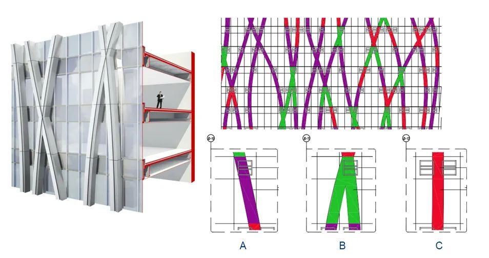 為追求水流的無序美感,塔樓頂端的鋁幕墻裝飾條均為不規(guī)則并伴有交叉的曲線。裝飾條轉(zhuǎn)角部位的鋁幕墻為工藝復(fù)雜雙曲面,項(xiàng)目中最大的一塊單元體線條,零部件數(shù)量超過100個單體,總面積達(dá)到19㎡,精度誤差要求不超過3mm,且安裝高度超過200米,制作和施工難度可想而知。