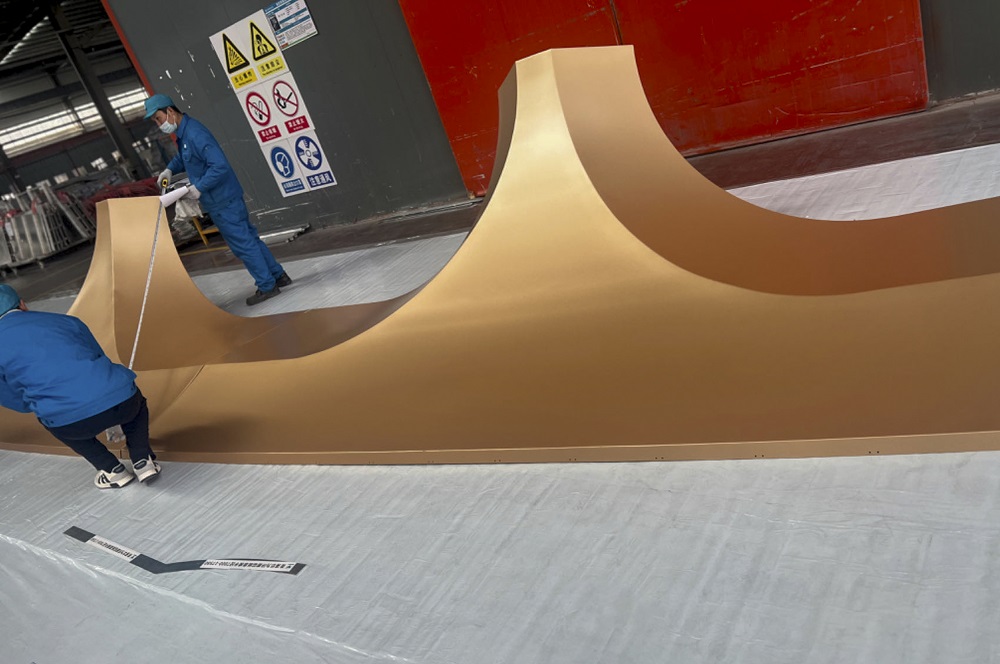 在華為練秋湖研發(fā)中心,為了研發(fā)人員有一個非常輕松愜意的工作與科創(chuàng)環(huán)境,每一個組團、每一棟單體都因各自功能性不同而被賦予不同的造型,所以幕墻的樣式也比較豐富。同時每一棟單體特色都以大板、大弧度的形式進行單獨或拼接展現(xiàn),對于加工技術以及加工廠要求都比較高。為配合設計要求,雅泰集團積極開展項目專攻、技術探討、工藝培訓,大大提升了鋁幕墻板件的成型度和美觀性。
