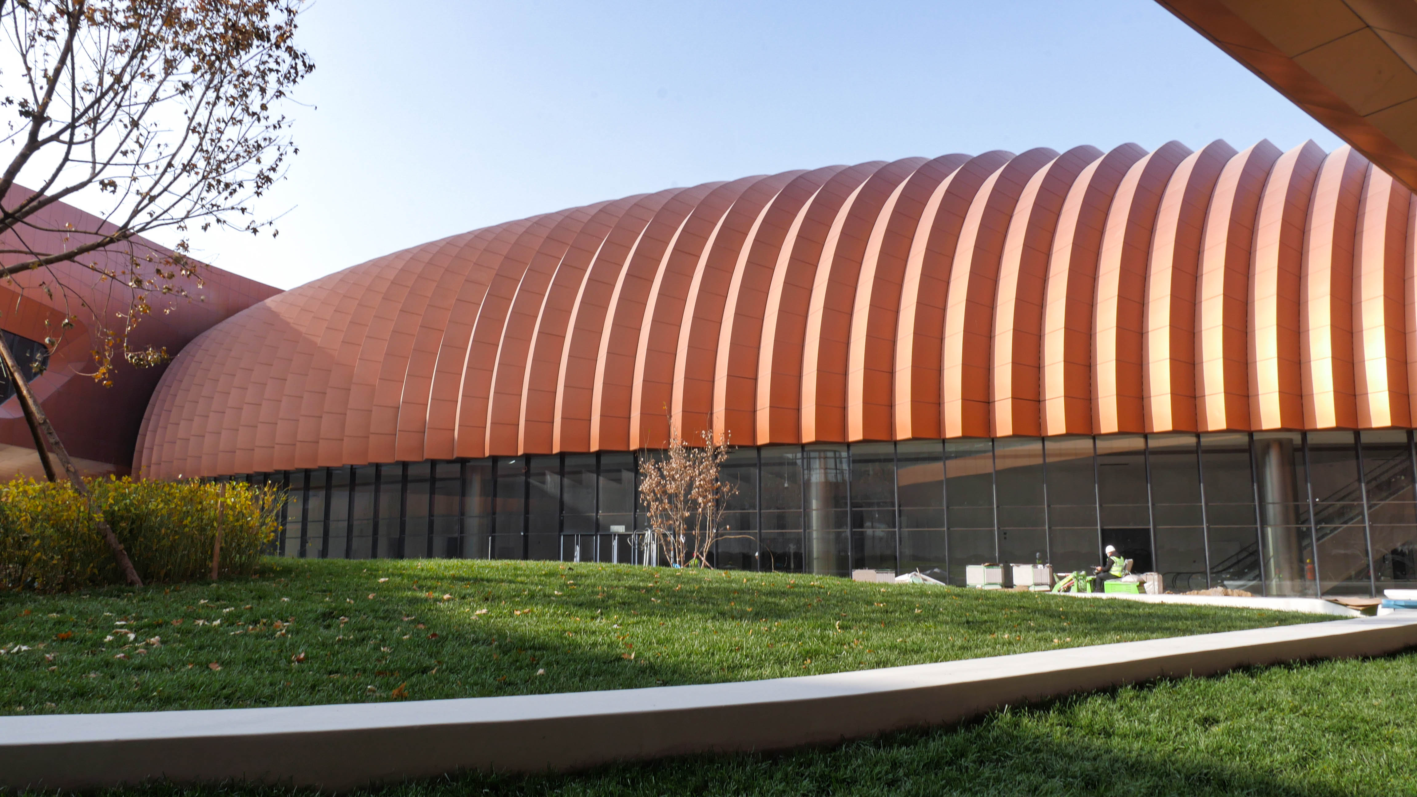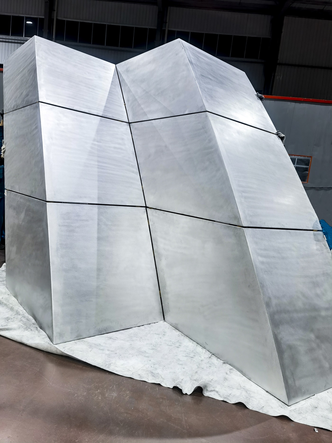 北京新國(guó)展“紫金絲帶”褶皺板,每件板上下、左右角度都有區(qū)別變化,左右呈發(fā)散式布局安裝,上下角度變化2.5度。尺寸偏差不超±1毫米,角度偏差不超過(guò)±0.5度,每件板都需專(zhuān)用模標(biāo)尺測(cè)量弧度。