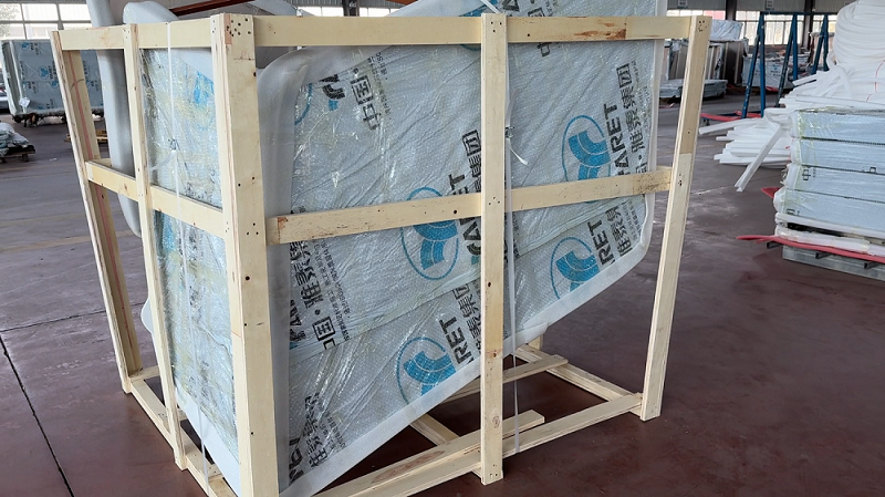 成品褶皺板經(jīng)檢驗(yàn)合格后,分別用保護(hù)膜,外附加一層氣泡膜進(jìn)行包裝防護(hù)。裝運(yùn)時(shí)釘制專(zhuān)用木箱進(jìn)行外圍運(yùn)輸防護(hù)。